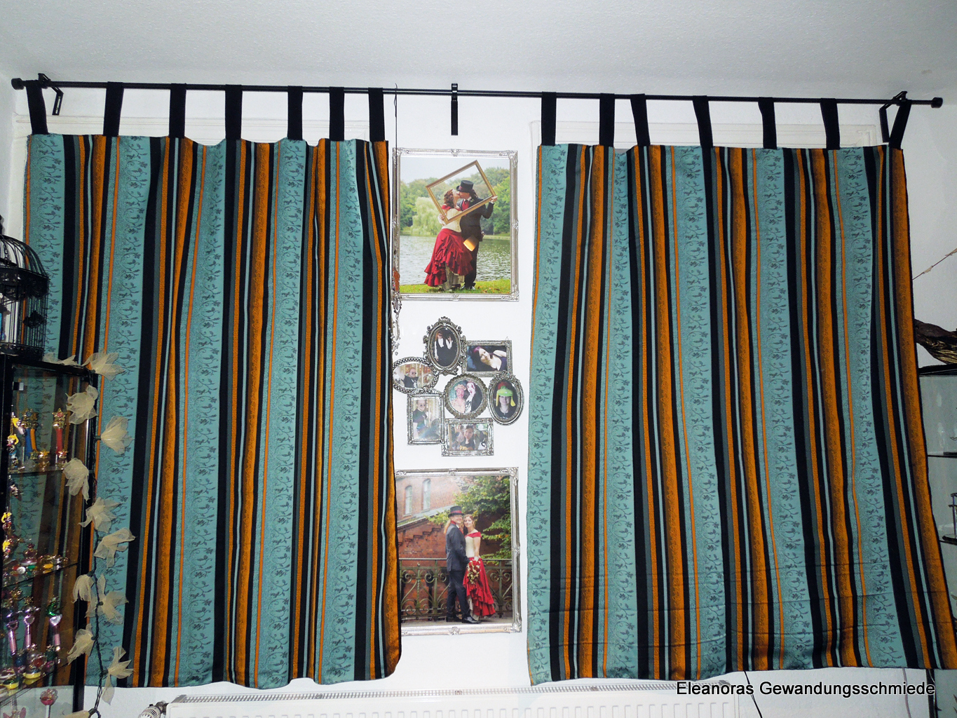 Aber es hat gereicht, wenn auch nur ganz knapp von der Oberkante des Fenstersturzes bis zur Fensterbank. Dafür sind die Schlaufen nicht mehr aus dem gleichen Stoff, sondern aus schwarzen Baumwollresten.